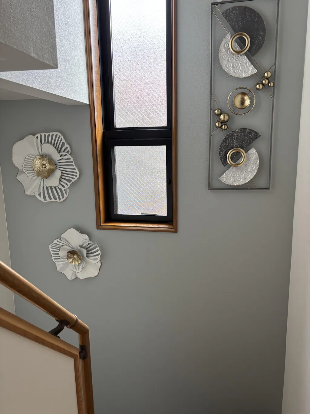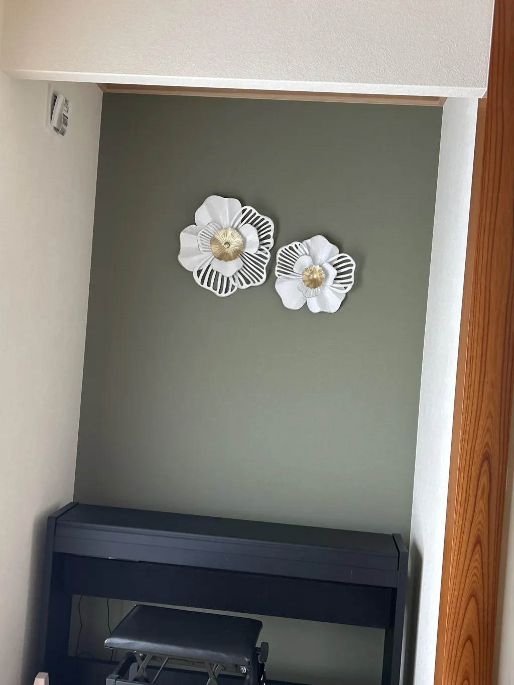 階段のクロスを張り替えたタイミングで購入いたしました。クロスの色はブルーグレーです。花の透かし部分からクロスの色が見えてきれいです。クロスは落ち着いた色合いですがお花のゴールドでゴージャスな雰囲気です。